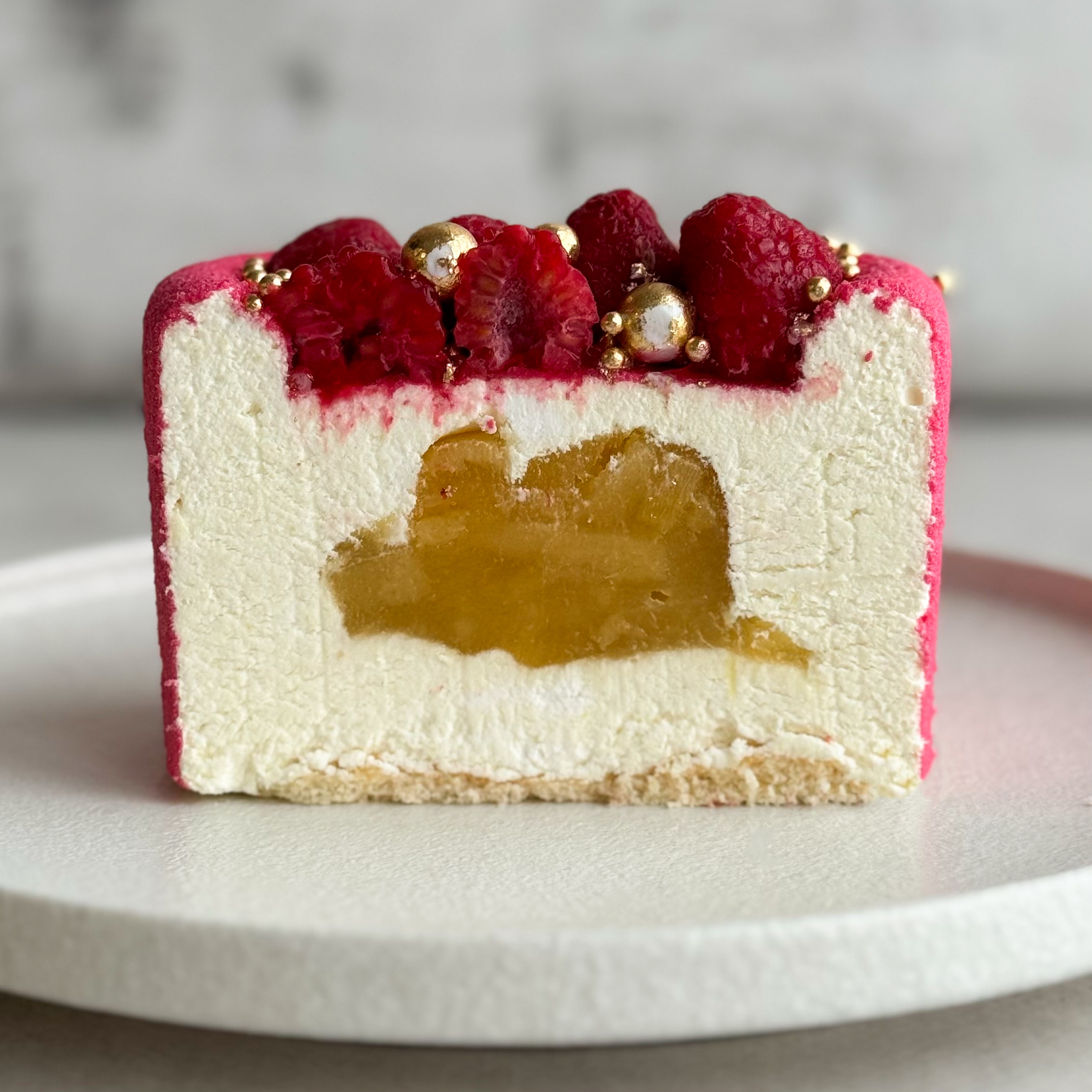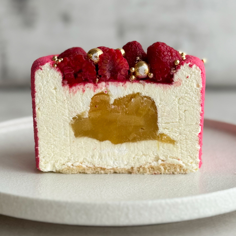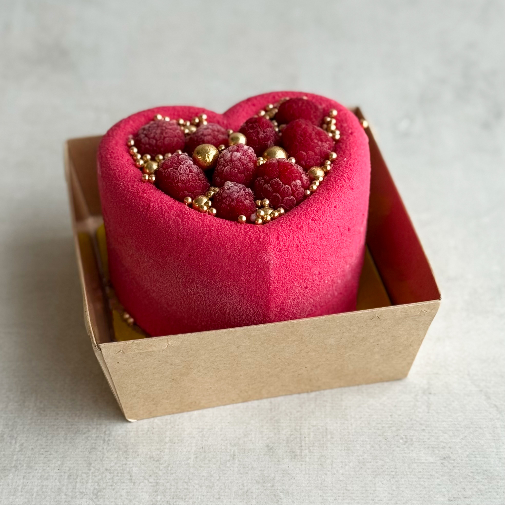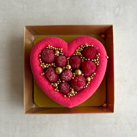 Бенто-торт Праздничный (Сердце с малиной) в индивид.упаковке. Нежный муссовый бенто-торт в форме сердца с начинкой из ананасового конфитюра с кусочками ананаса на тонкой бисквитной подложке. Торт украшен спелыми ягодами малины и золотым декором.